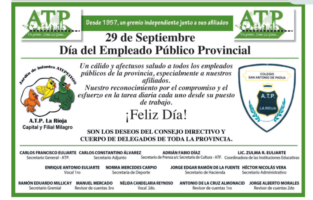 ATP. El Consejo Directivo Y Cuerpo De Delegados De Toda La Provincia. Hacen Presente El Saludo A Todos Los Empleados Publicos, Especialmente A Los Afiliados Deseandoles Un Feliz Dia.