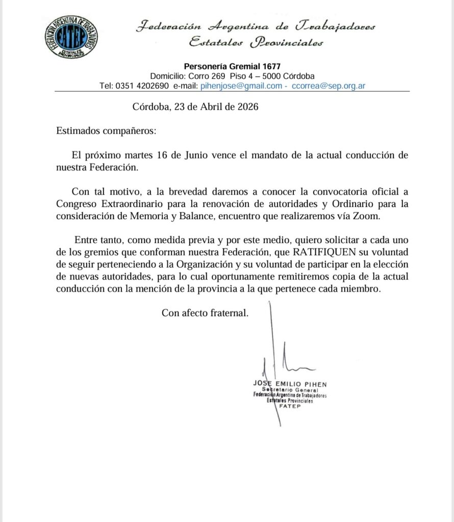 ATP. Este 16 De junio ATP Participará Del Congreso Extra Ordinario Para La Renovación De autoridades De La Federación Argentina De Trabajadores Estatales Provinciales.